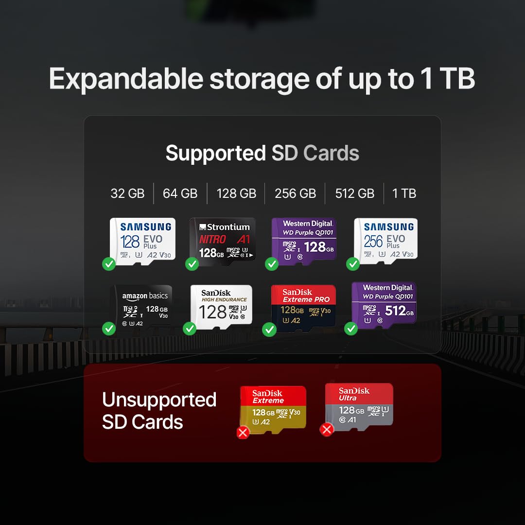 - |LOOP RECORDING| Supports upto 1 TB SD Card. Seamless Loop Recording system provides unlimited storage from the SD card. It will automatically overwrite the non-essential part when the memory card gets full. (SD CARD NOT INCLUDED)